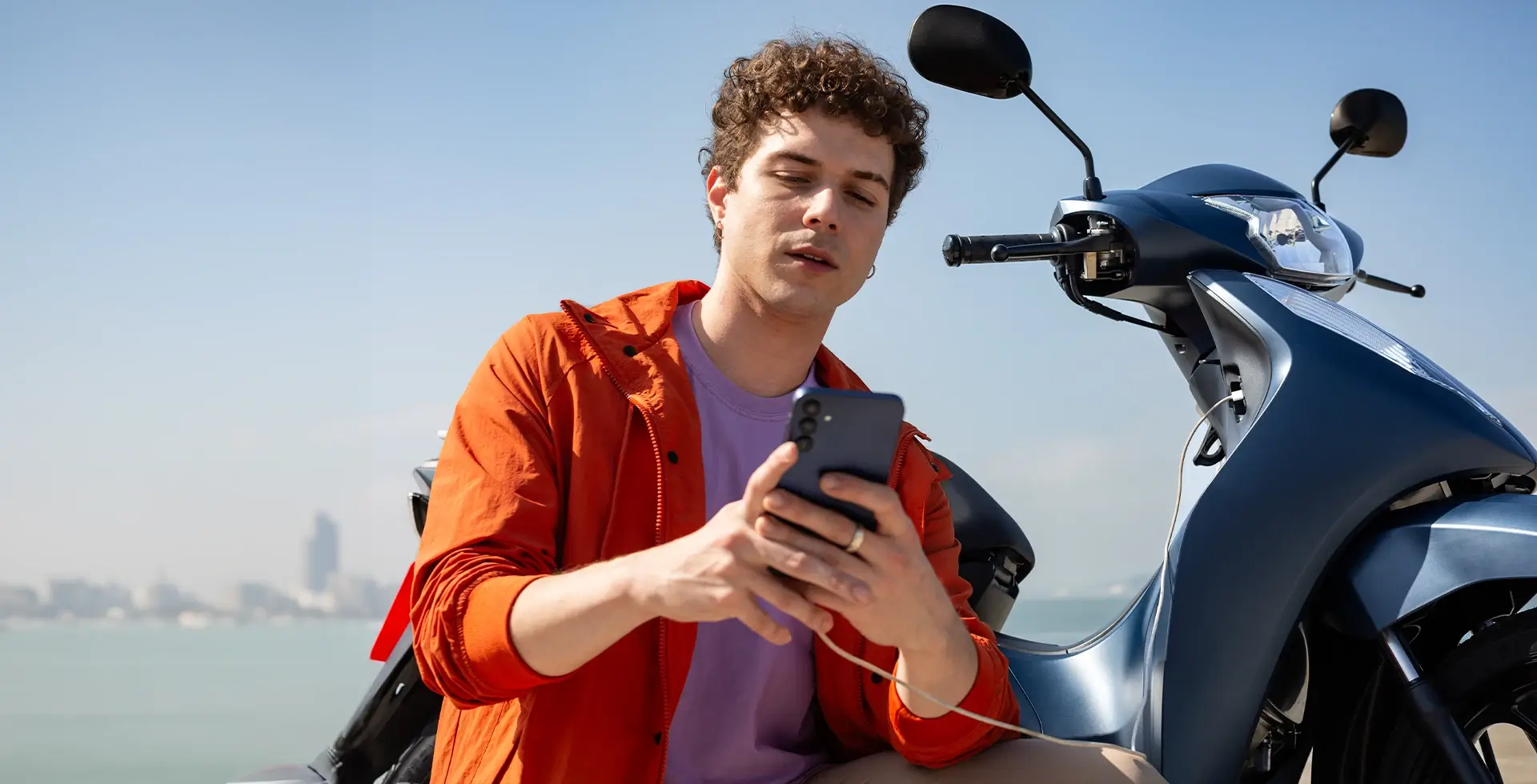 Moderna e conveniente, a nova Honda Biz 125 EX possui entrada USB-C para carregar o seu celular, para você nunca ficar sem bateria.